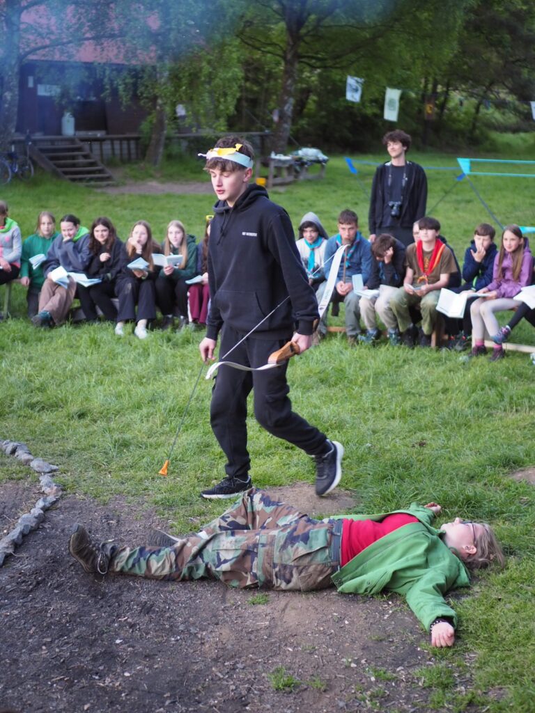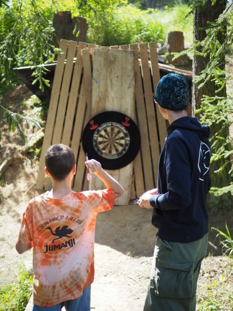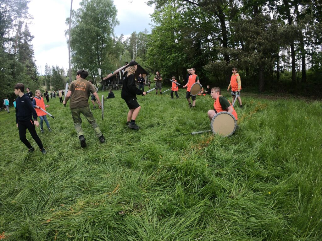 Po rozdělení do hracích týmů jsme se vydali na jednotlivá olympijská stanoviště. Celé dopoledne jsme bojovali v různých disciplínách jako byl hod koulí, sprint, maratonský běh, lukostřelba a mnoho dalšího. Po dopoledním bloku her následoval výborný gulášek z naší kuchyně, který Připravil Pytlák s Fíkem pro všechny účastníky, celkem tedy cca 160 porcí. Jen pro zajímavost padlo na tento guláš 8 kg cibule, 12 kg masa a bylo ho cca 60 litrů. Po obědě byl poledňák a odpoledne následoval další herní blok, tentokrát šlo o týmové klání v basebice, ringu, tukruhu, fotbalu a přehazované.