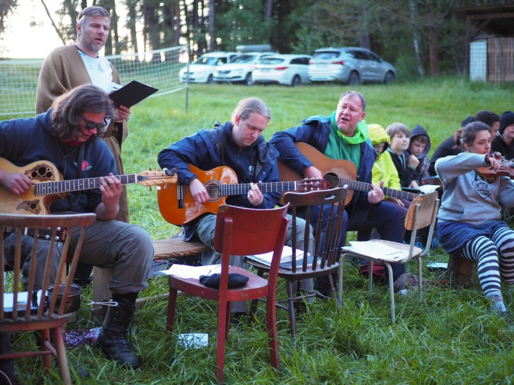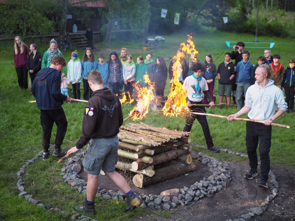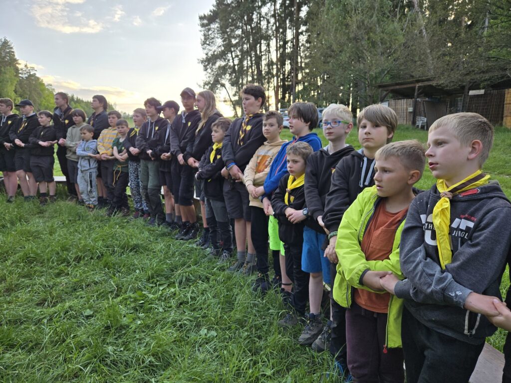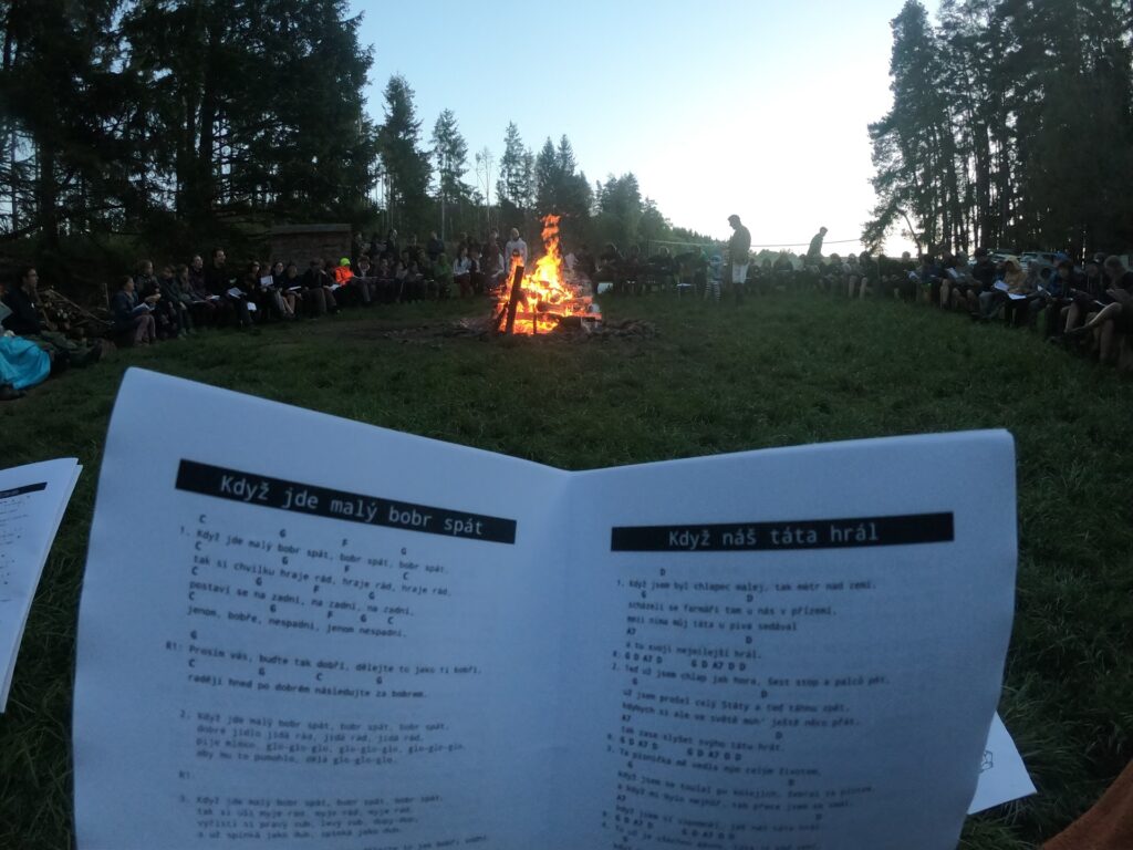 Po večeři, kterou si každý oddíl zajišťoval sám následoval slavností oheň, který se v průběhu dne připravoval i v součinnosti s palivci, kteří byli vybráni z oddílů pořádajících sraz někdy v minulých letech. Všichni jsme se sešli u ohniště, palivci slavnostně zapálili oheň, a to včetně paliveckých slov, zazpívali jsme červená se line záře, poslali si signál a pak začalo to pravé veselý. Čerpali jsme písničky ze srazového zpěvníku, proběhly super scénky oddílů a do noci se hrálo.